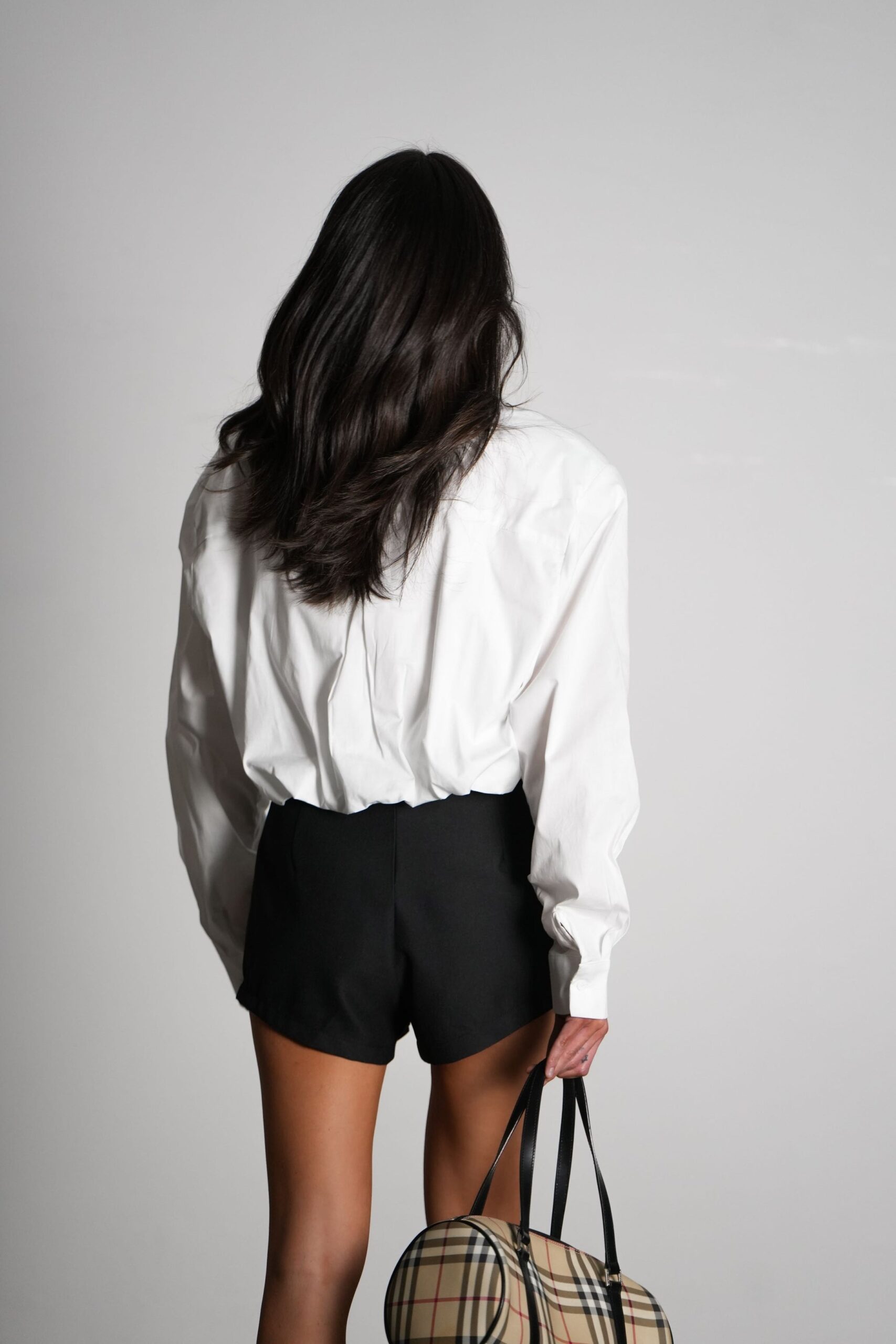| חולצה מכופתרת עם כריות כתפיים אורך קרופ | כיס קידמי | גומי אחורי
