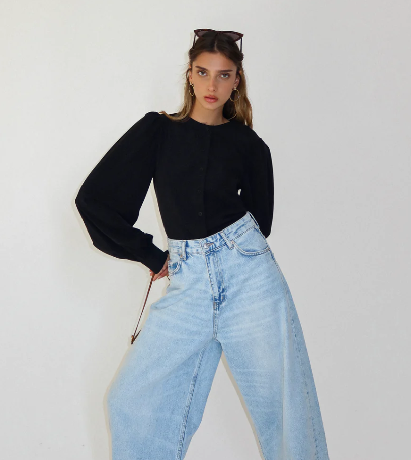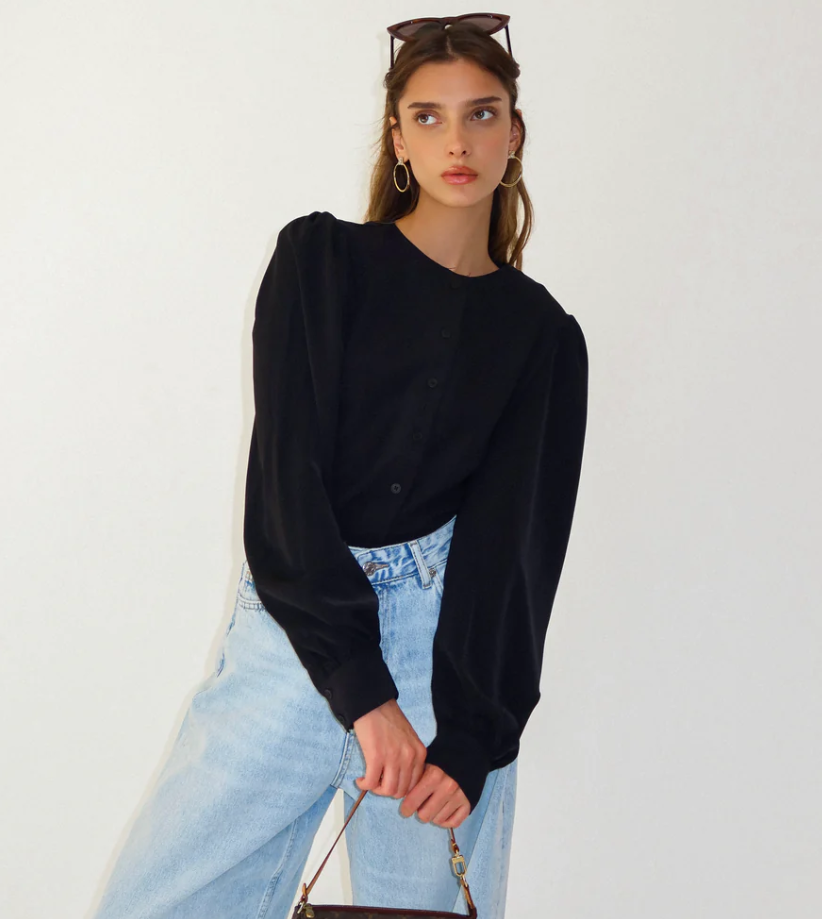 חולצה מכופתרת מחוייטת כתפי כיווץ , מנג׳טים בידיים , וסגירת שינה כפתורים