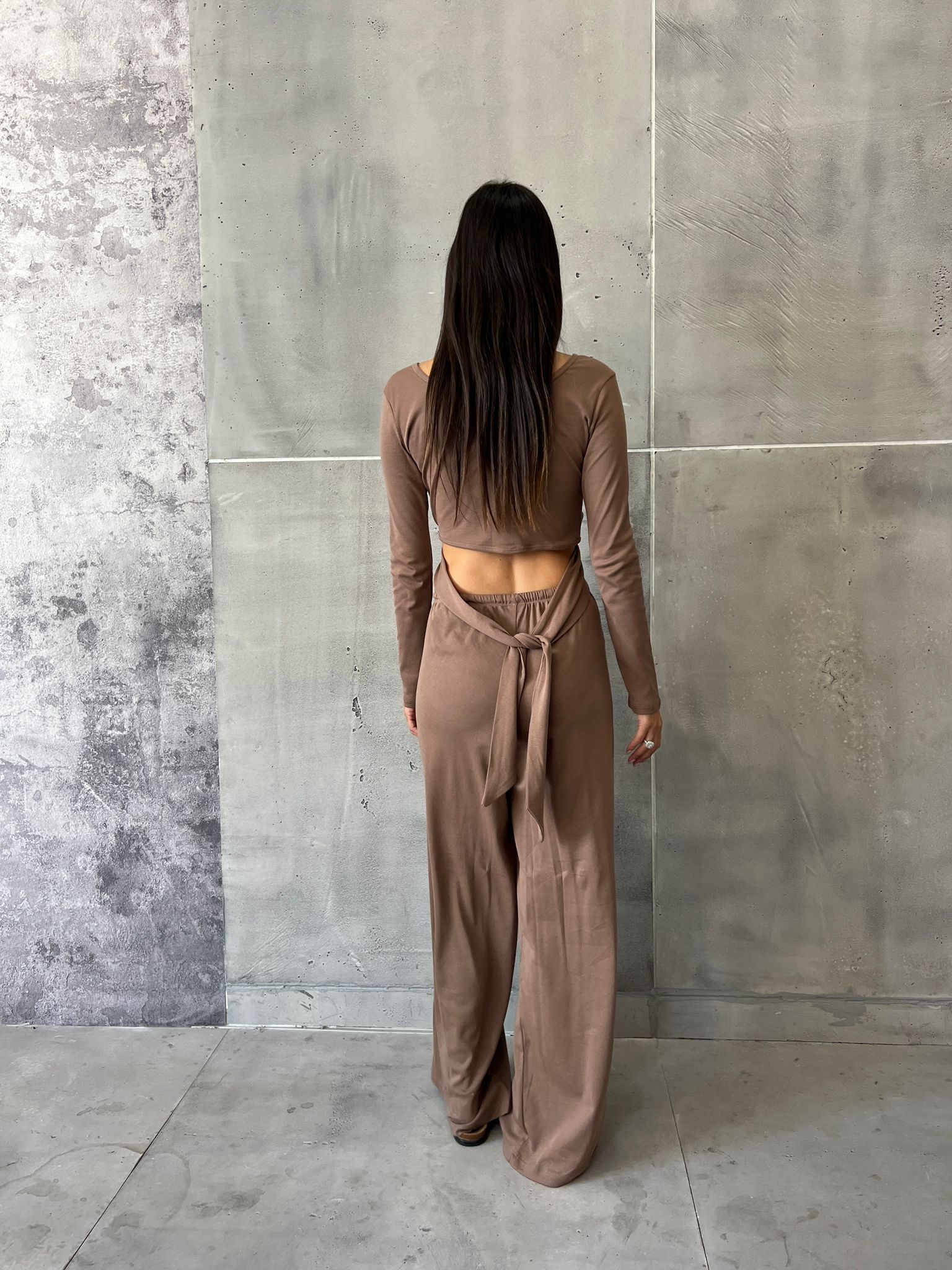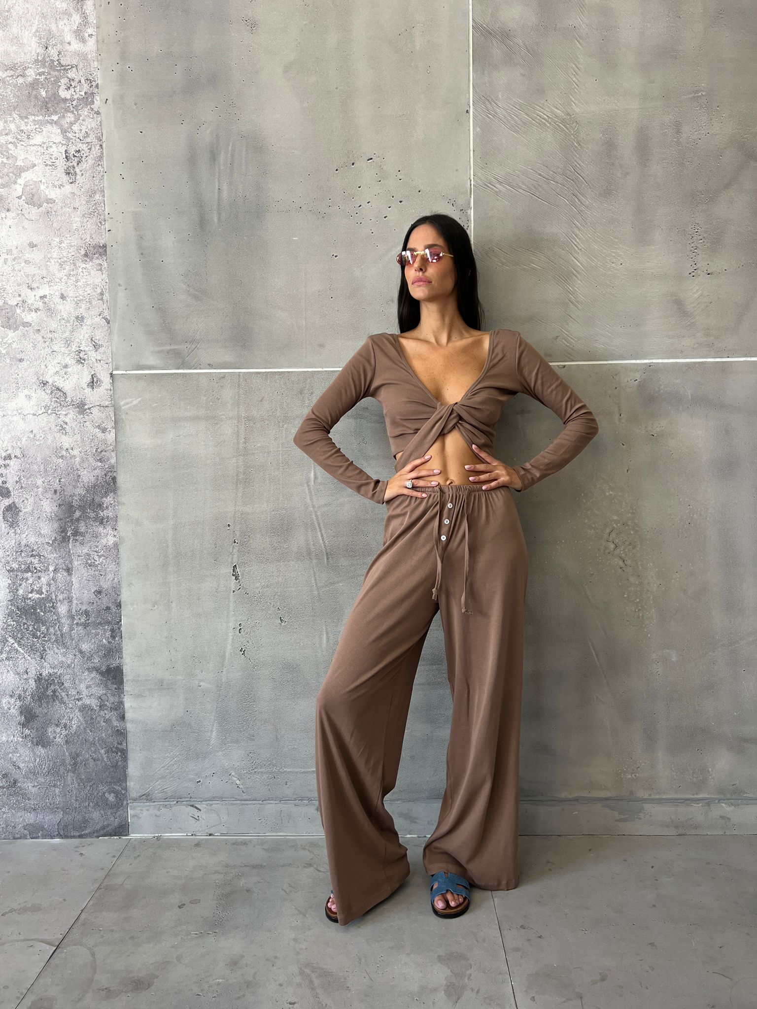 קולקצית סתיו של המעצבת L&B חליפת מכנס בגזרה ישרה – חולצת קרופ מעטפת שרוולים ארוכים