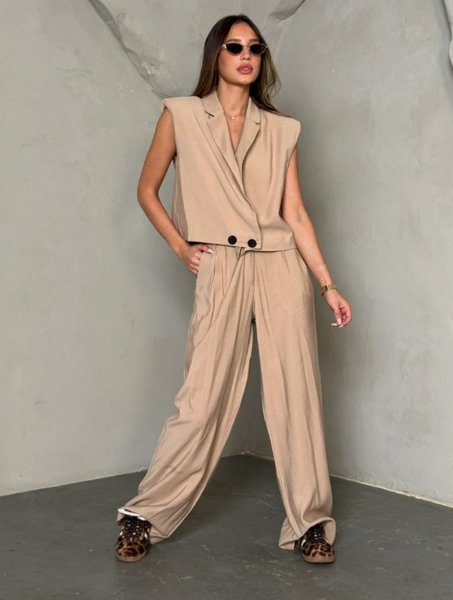 סט של מכנס בגזרה רחבה עם פנסים בשילוב עליונית ווסט עם סגירת כפתור וכריות בכתפיים מגיעה במידות S M