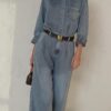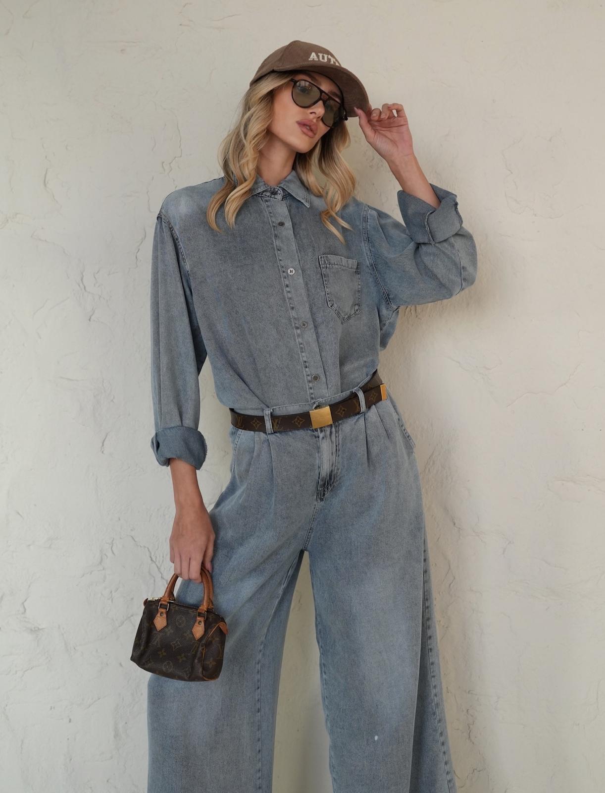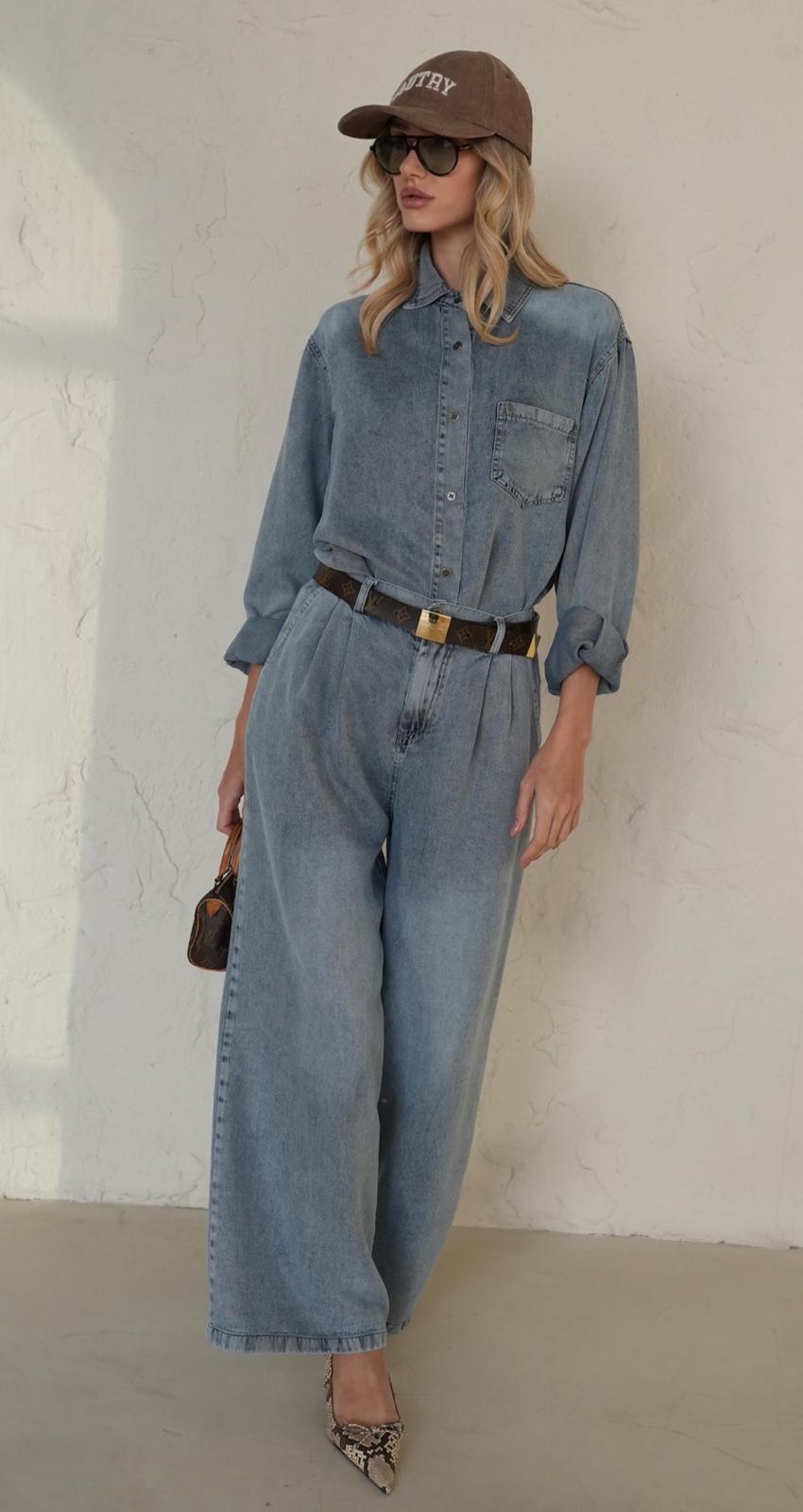 כוללת מכנס בגזרה רחבה ונשפכת בגובה מותן מחמיא, וחולצה מכופתרת בגזרת אוברסייז שניתן לקשור