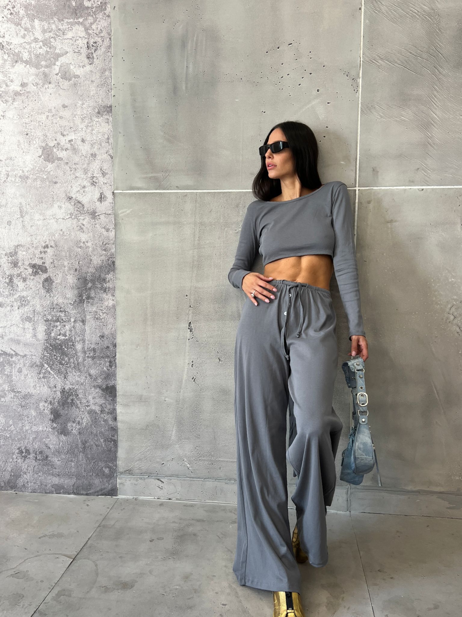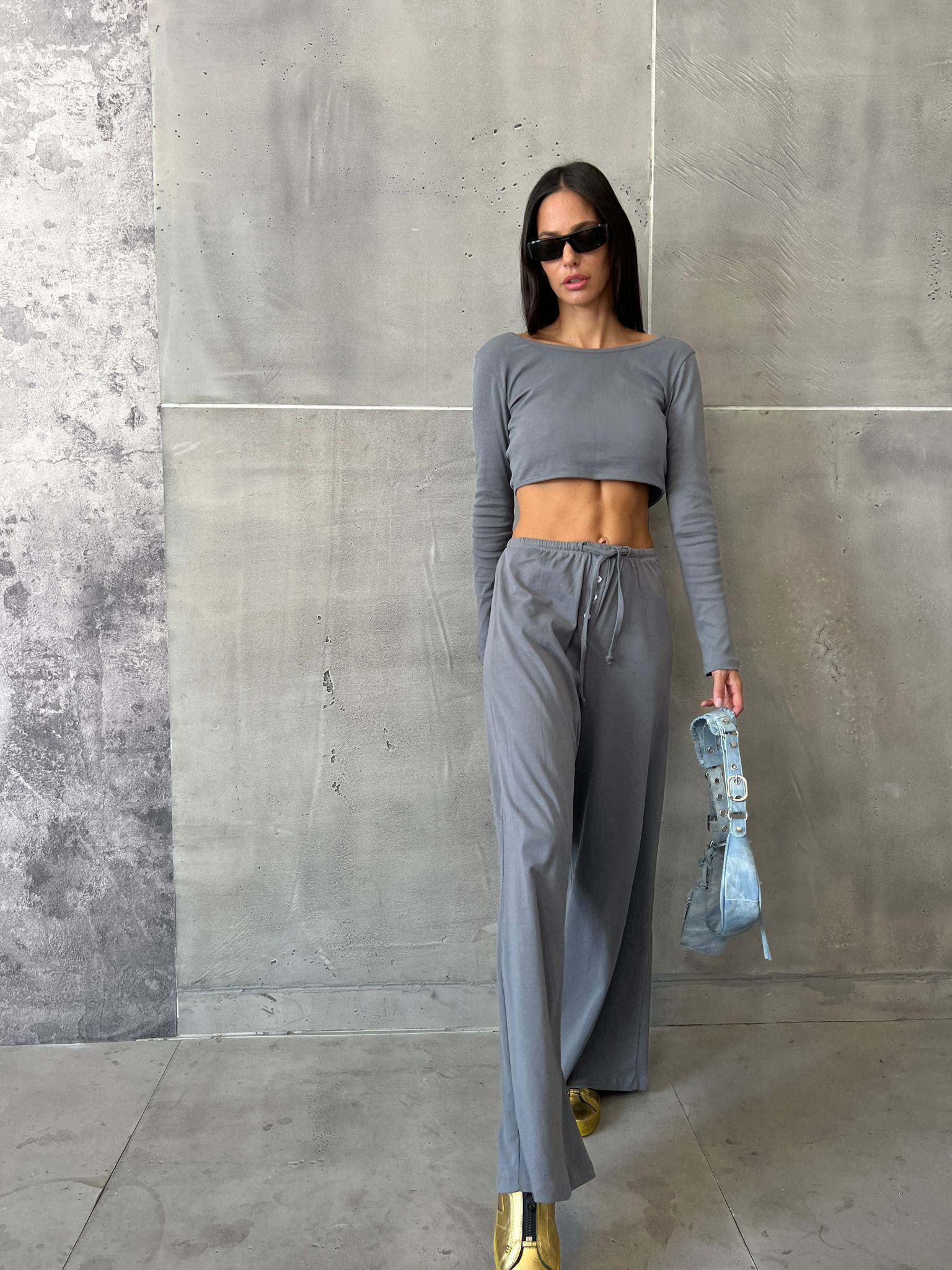 קולקצית סתיו של המעצבת L&B חליפת מכנס בגזרה ישרה – חולצת קרופ מעטפת שרוולים ארוכים