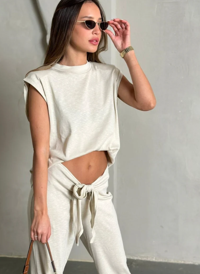 סט של מכנס לוז עם קשירה במותן בשילוב חולצה ללא שרוולים בד דקיק ונעים וגזרה היסטרית