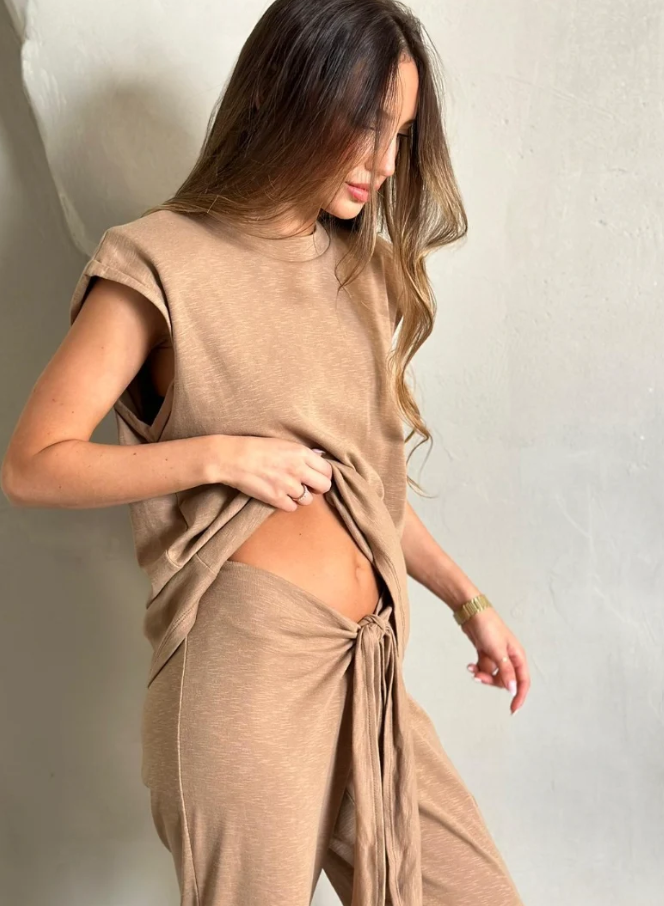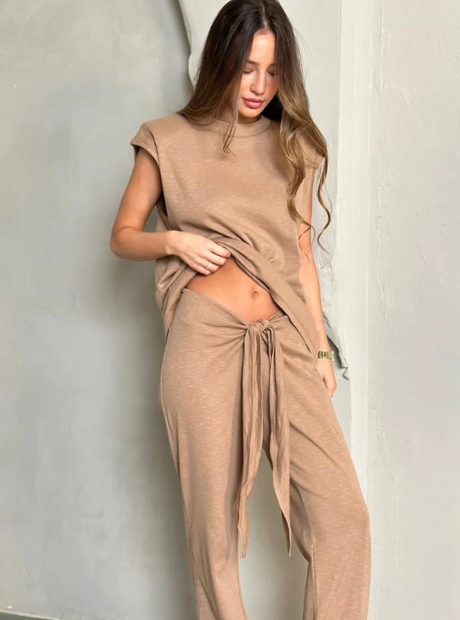 סט של מכנס לוז עם קשירה במותן בשילוב חולצה ללא שרוולים בד דקיק ונעים וגזרה היסטרית