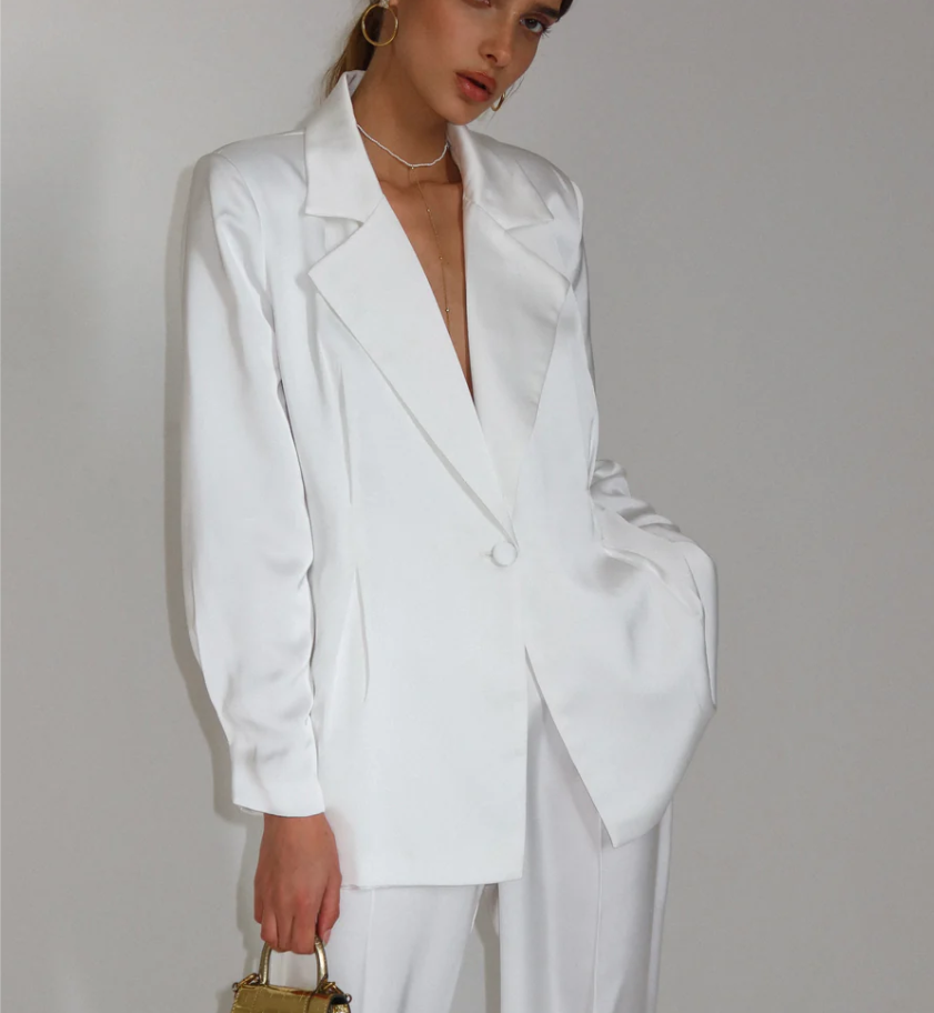 חליפת סאטן 2 חלקים | בלייזר עם כפתור באמצע | מכנסי סאטן עם כיסים בצדדים