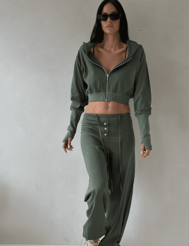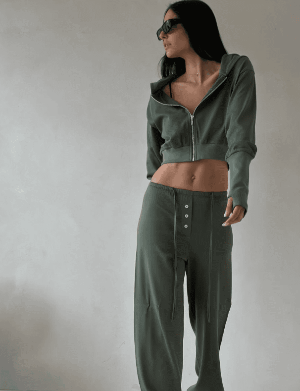 קולקצית חורף של המעצבת L&B חליפת מכנס בשילוב ג'קט קפוצון קרופ סגירת רוכסן מכנס בגזרה רחבה עם גומי במותן ושרוך לקשירה מידות: S/M