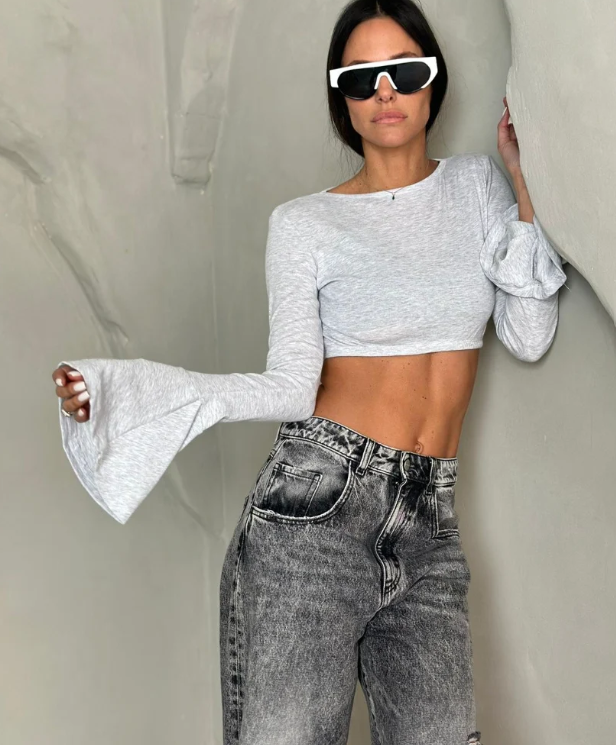 טישירט בייסיק קרופ עם גומי בבטן ושרוול מלמלה