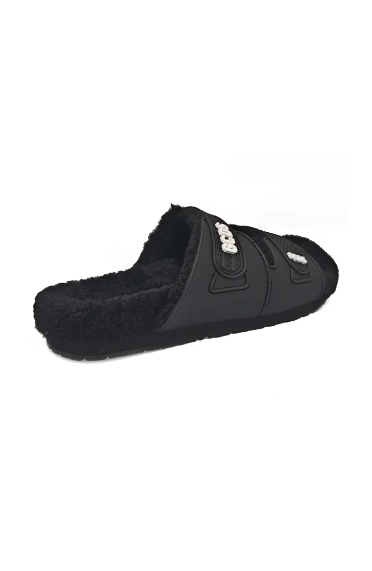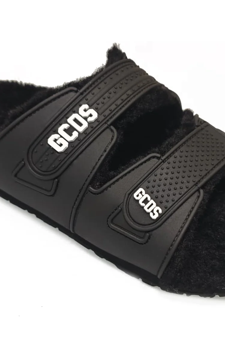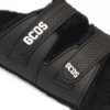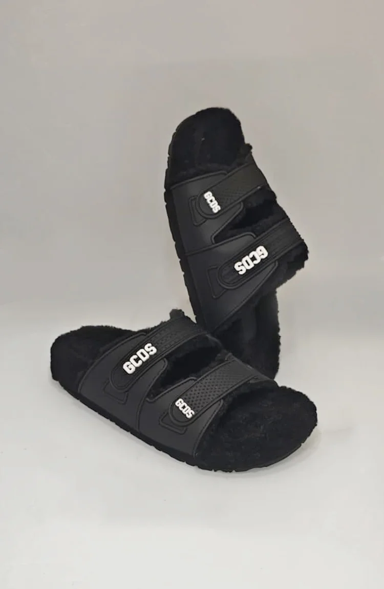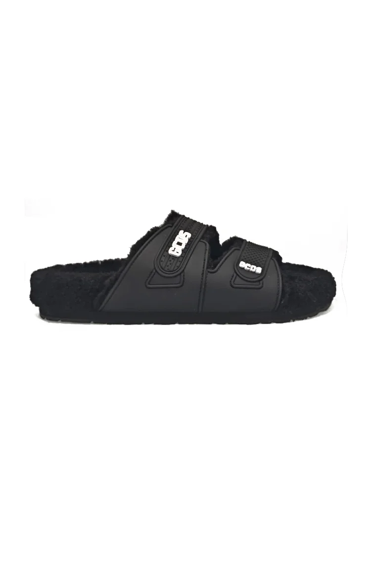 כפכפי פרווה בעיצוב בית האופנה GCDS. כפכפים שיקיות בעלות בטנת פרווה סינטטית נוחה ונעימה. הכפכפים מציגות את העיצוב הקלאסי של GCDS הכולל זוג רצועות עם לוגו המותג וכרית עקב ממותגת לנוחות מרבית, כפכפי פרווה חורפיות.