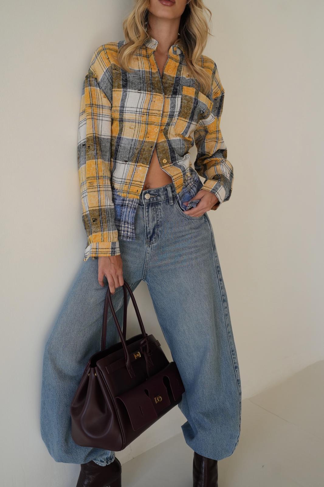 מכופתרת משבצות ניתנת לקשירה כיס קידמי.