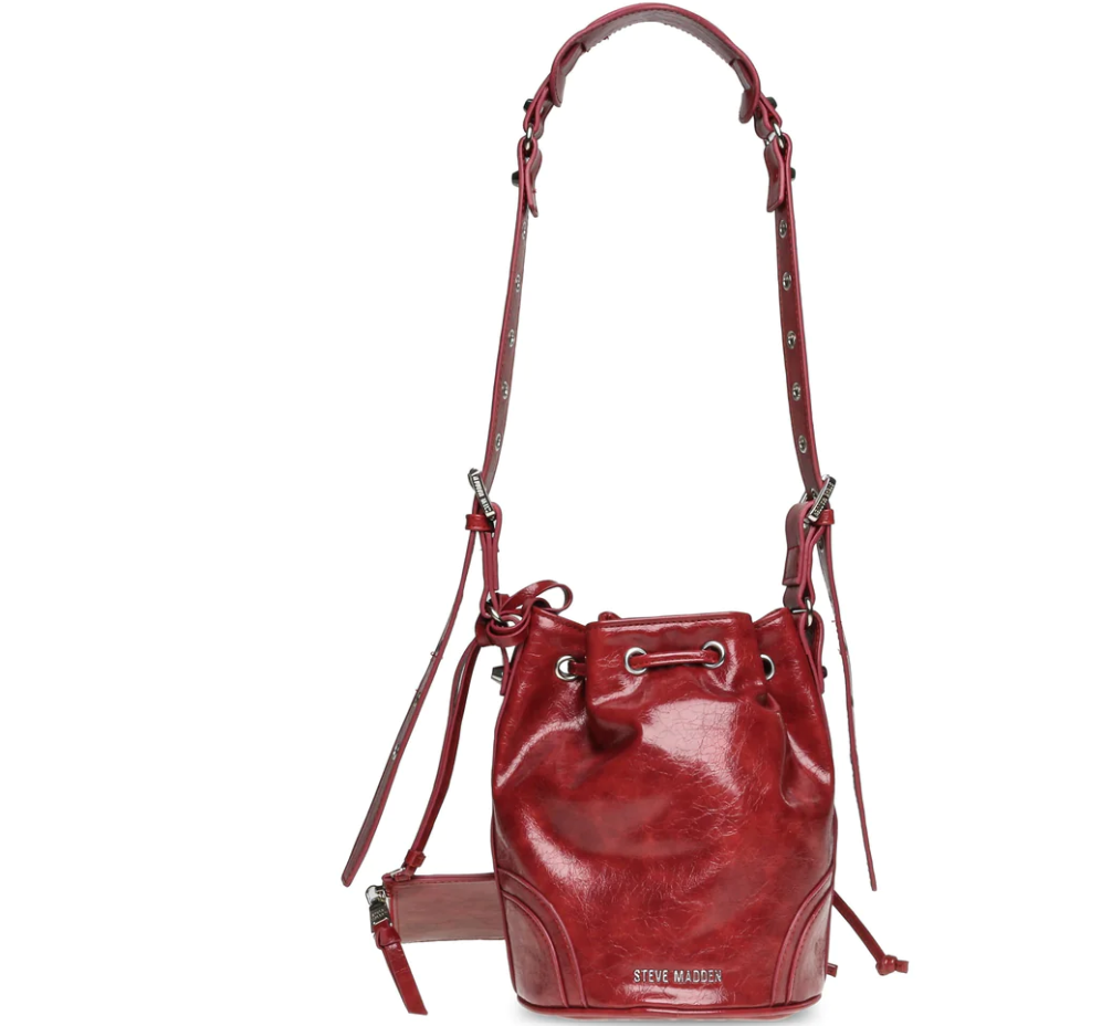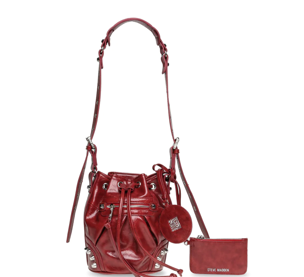 תיק באקט לנשים בשחור בגימור מבריק עם ניטים כסופים מבית סטיב מאדן
