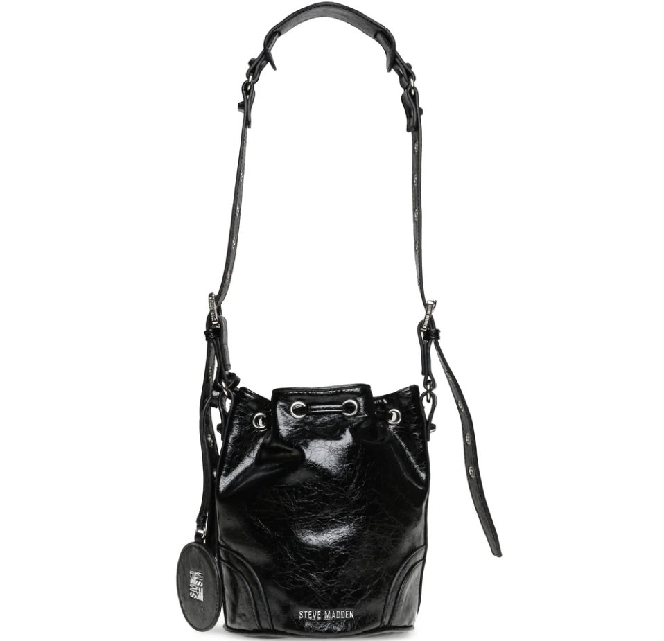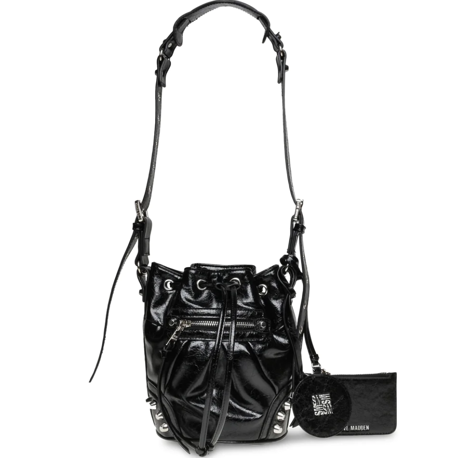 תיק באקט לנשים בשחור בגימור מבריק עם ניטים כסופים מבית סטיב מאדן