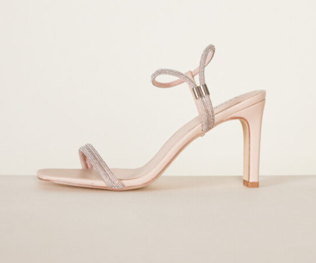 סנדל עקב גבוה בצבע לבן עם רצועה קדמית משובצת באבנים בנצנוץ עדין.