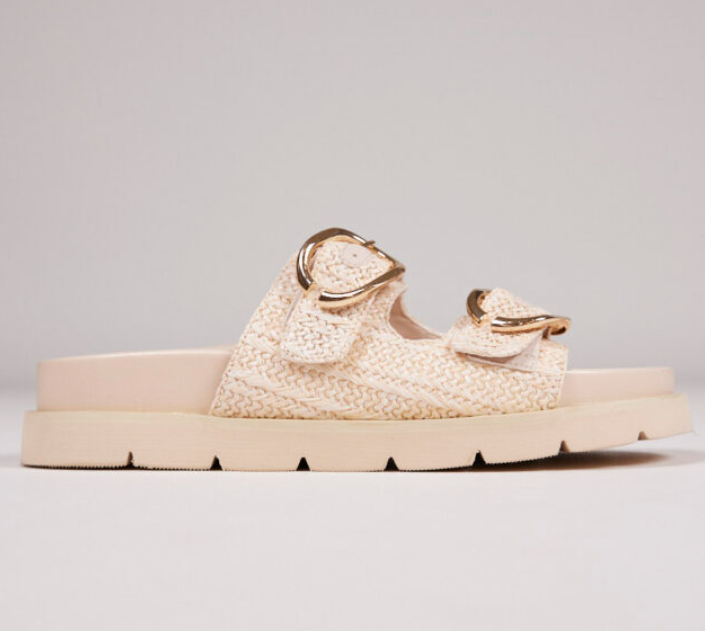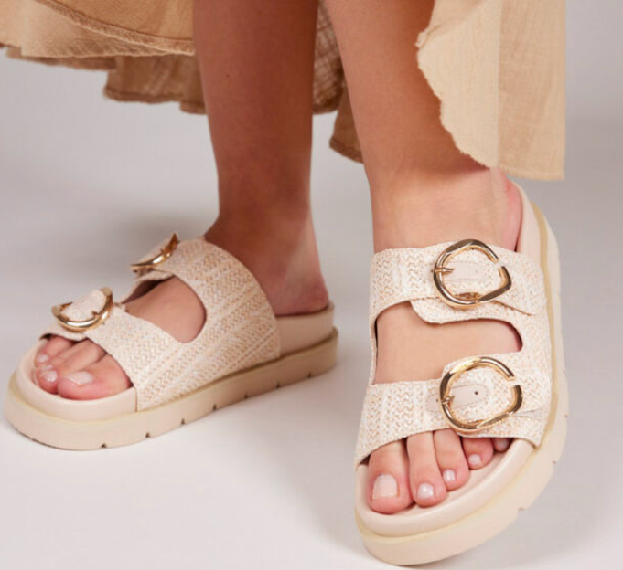 כפכפים שטוחים בשילוב רצועות אבזם מתכת מעוגל.